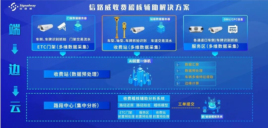 信路威基于大數(shù)據(jù)、AI等技術(shù),采用端-邊-云三層架構(gòu)設(shè)計(jì),整合車輛的多維數(shù)據(jù),還原、擬合出車輛的完整行駛路徑,基于多維度數(shù)據(jù)分析異常通行特征,組合生成稽核模型,應(yīng)對(duì)多種逃費(fèi)場(chǎng)景,為高速運(yùn)營(yíng)管理單位提供異常通行車輛稽查的有效數(shù)據(jù)與完整證據(jù)鏈,助力收費(fèi)系統(tǒng)智慧升級(jí)。
