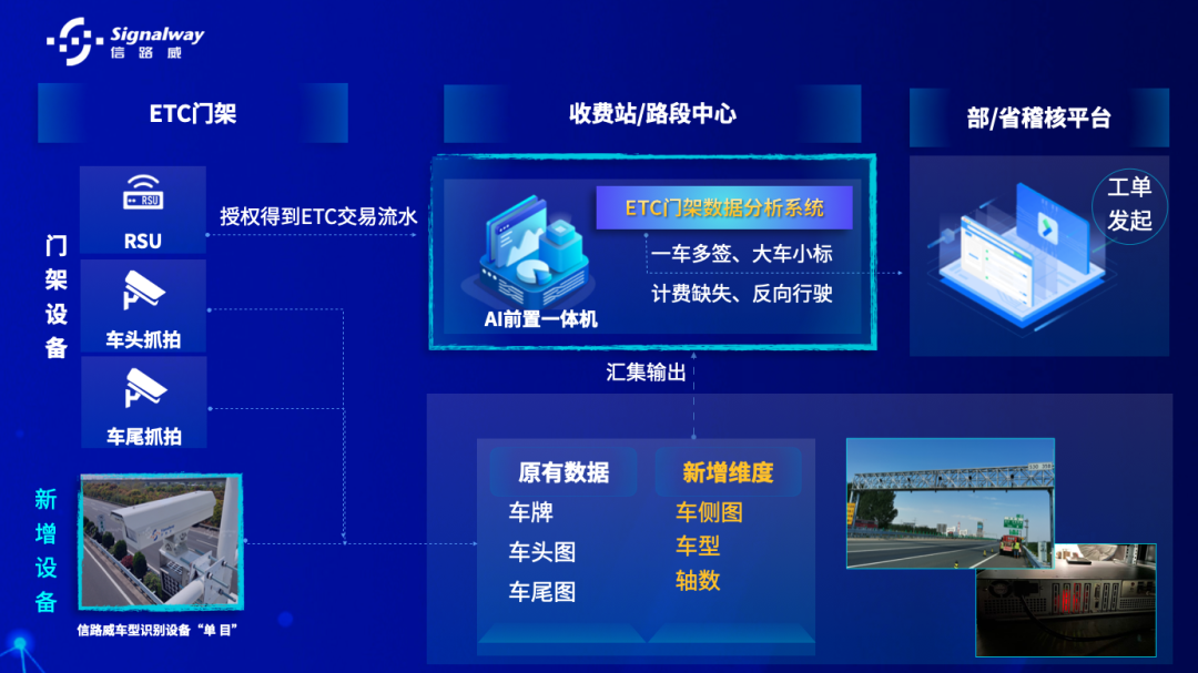 天昂公司通過在京哈高速公路ETC門架部署信路威AI車型識(shí)別設(shè)備“單目”,識(shí)別車輛的車側(cè)圖、車型、軸型、輪/軸數(shù)等多維特征數(shù)據(jù),并把數(shù)據(jù)上傳至ETC門架數(shù)據(jù)分析終端,經(jīng)過數(shù)據(jù)融合分析比對(duì),有效識(shí)別“大車小標(biāo)”“貨車客標(biāo)”“反向行駛”“一車多簽”等逃費(fèi)行為,實(shí)現(xiàn)“特殊車輛管理”“異常數(shù)據(jù)分析”“流量分析’等功能,對(duì)通行車輛進(jìn)行全場(chǎng)景的監(jiān)控和管理,為收費(fèi)稽核提供科技的數(shù)據(jù)支撐。