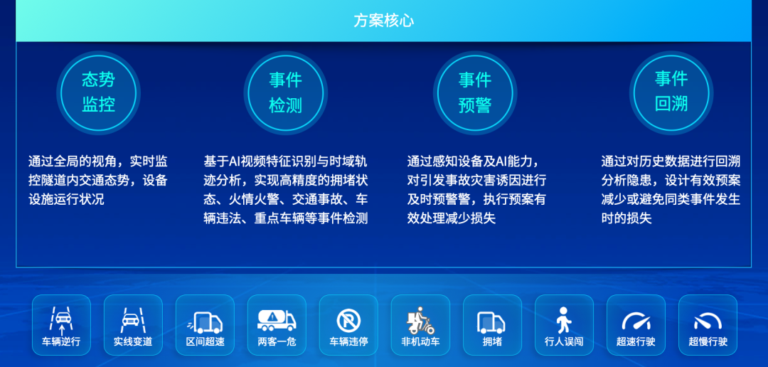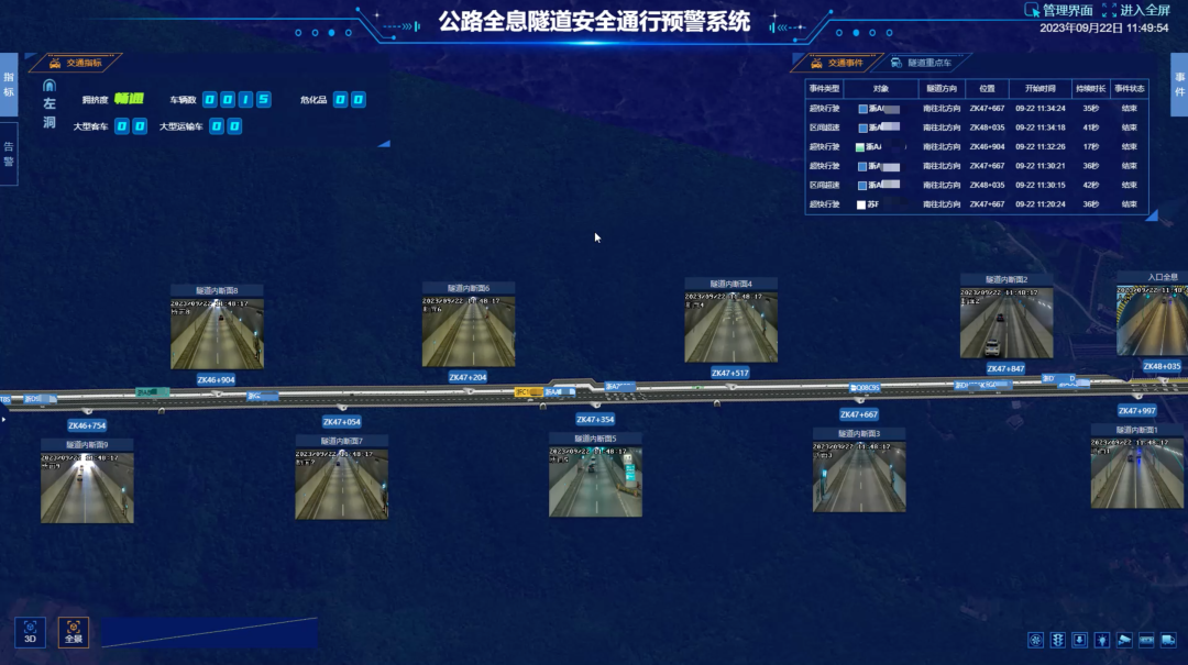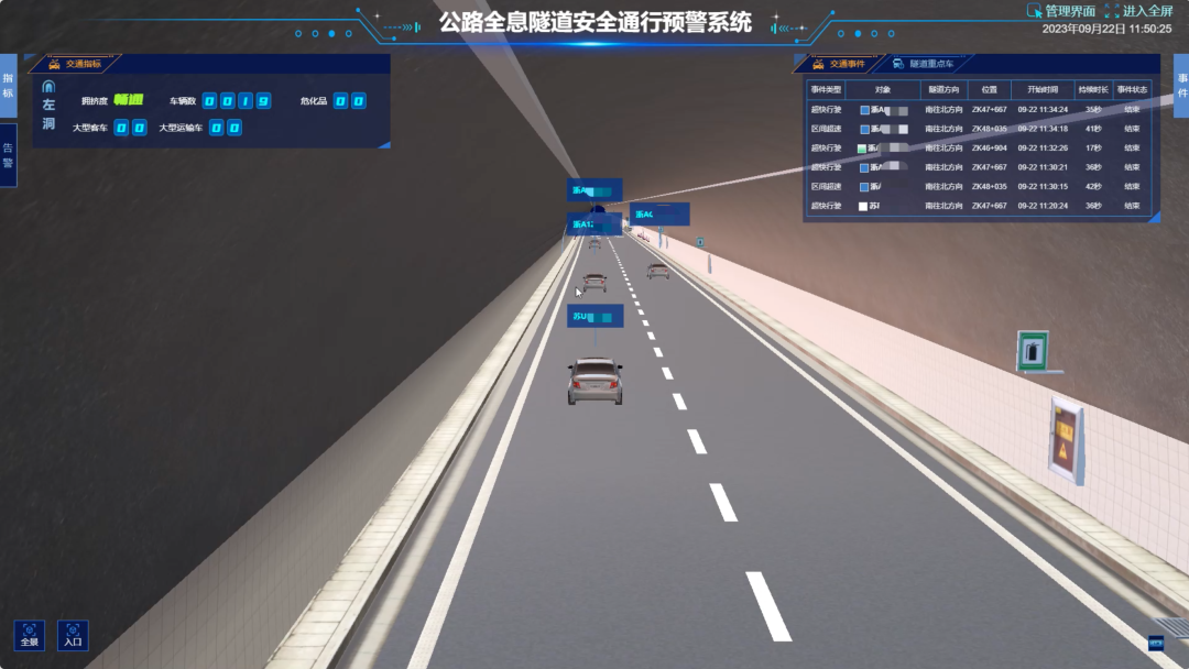 信路威公路全息隧道安全通行預(yù)警系統(tǒng),是一套將高精地圖和三維模型相結(jié)合的可視化應(yīng)用系統(tǒng),基于數(shù)字孿生技術(shù),將交通實(shí)景和事件信息在系統(tǒng)上進(jìn)行數(shù)字重構(gòu),提供與真實(shí)場景時空基準(zhǔn)一致的數(shù)字化映射。在隧道中,通過布設(shè)多個智慧基站,將分段、獨(dú)立的感知數(shù)據(jù)進(jìn)行關(guān)聯(lián)融合形成全域信息。同時,將數(shù)據(jù)模型和智能算法相結(jié)合,依托全息感知網(wǎng),對全隧道交通數(shù)據(jù)進(jìn)行匯聚、交互、交換轉(zhuǎn)發(fā)等處理,實(shí)現(xiàn)事件識別、統(tǒng)計(jì)分析和處理加工,從而構(gòu)建隧道數(shù)字孿生底座。基于數(shù)字孿生底座可以建設(shè)多個數(shù)字化應(yīng)用場景,如:提供“兩客一?!钡忍胤N車輛全域跟蹤,實(shí)時孿生車輛的位置、速度等信息,并可以對隧道內(nèi)違規(guī)停車、變道、逆行、超速等多種交通事件信息的實(shí)時動態(tài)孿生,實(shí)現(xiàn)對隧道的智能化、數(shù)字化管理。信路威公路全息隧道安全通行預(yù)警系統(tǒng),通過全息可視化的能力,讓隧道的監(jiān)控有空間感、更直觀,AI賦能推動隧道安全管理更智慧!
