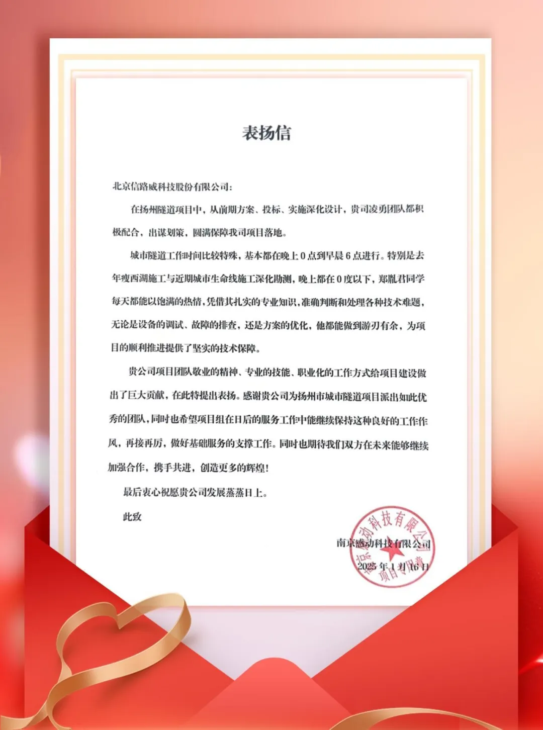 近日,信路威收到南京感動(dòng)科技有限公司發(fā)來的表揚(yáng)信。信中對(duì)信路威項(xiàng)目團(tuán)隊(duì)在揚(yáng)州隧道項(xiàng)目建設(shè)過程中體現(xiàn)出的專業(yè)技術(shù)水平進(jìn)行了點(diǎn)贊,對(duì)項(xiàng)目組技術(shù)人員在艱難條件下兢兢業(yè)業(yè)的工作熱情給予了高度評(píng)價(jià)和贊譽(yù)。