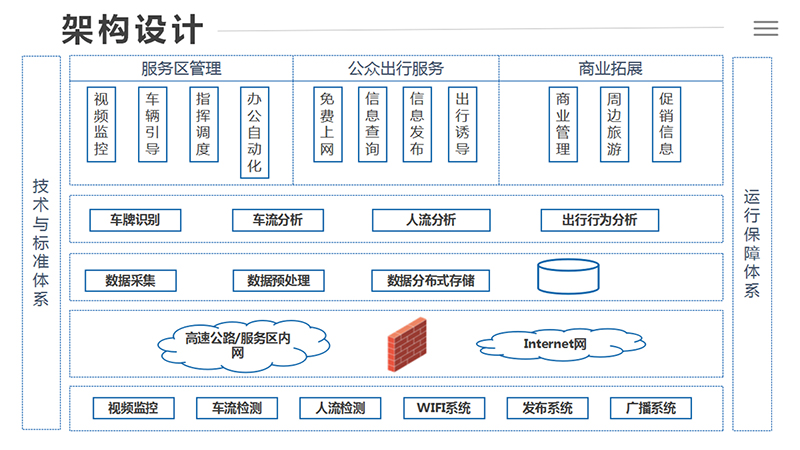 高速公路智慧服務(wù)區(qū)系統(tǒng)是重點(diǎn)針對(duì)高速公路運(yùn)營(yíng)管理尤其是服務(wù)區(qū)經(jīng)營(yíng)決策和車輛信息管理、旅客管理面臨的突出問(wèn)題,利用信息技術(shù)手段整合現(xiàn)有信息資源,采用頂層設(shè)計(jì)的方法,采用最先進(jìn)的圖像精確拼接識(shí)別算法和技術(shù),獲取服務(wù)區(qū)內(nèi)車輛信息和數(shù)據(jù),實(shí)現(xiàn)服務(wù)區(qū)車輛信息采集、服務(wù)區(qū)車輛流量監(jiān)測(cè)和統(tǒng)計(jì)、服務(wù)區(qū)內(nèi)車輛交通違法行為和逃費(fèi)行為取證、客流檢測(cè)及管理等功能,為服務(wù)區(qū)的經(jīng)營(yíng)管理提供信息服務(wù),為高速公路聯(lián)網(wǎng)收費(fèi)系統(tǒng)提供逃費(fèi)車輛信息服務(wù),杜絕車輛在服務(wù)區(qū)內(nèi)的逃費(fèi)行為,提升旅客舒適性,提高高速公路管理尤其是服務(wù)區(qū)的經(jīng)營(yíng)管理效益,打造現(xiàn)代化的智慧服務(wù)區(qū)。