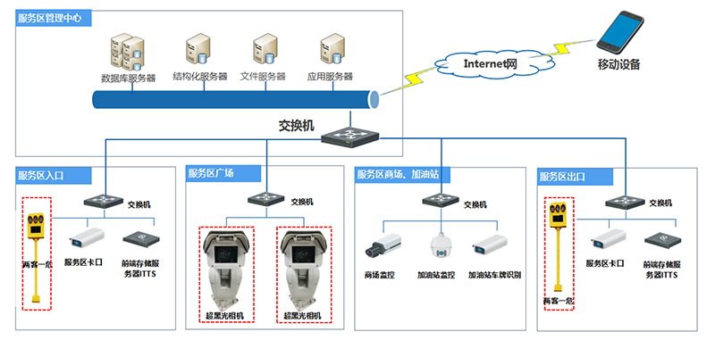 高速公路智慧服務(wù)區(qū)系統(tǒng)主要由服務(wù)區(qū)出入口系統(tǒng)、服務(wù)區(qū)廣場(chǎng)全景監(jiān)控系統(tǒng)、服務(wù)區(qū)客流監(jiān)測(cè)系統(tǒng)等構(gòu)成。服務(wù)區(qū)出入口系統(tǒng)對(duì)進(jìn)出服務(wù)區(qū)的車輛進(jìn)行車型分析指引兩客一危車輛進(jìn)入指定區(qū)域,重點(diǎn)對(duì)貨車出入口特征進(jìn)行比對(duì)和分析并上報(bào)到平臺(tái);服務(wù)區(qū)廣場(chǎng)全景監(jiān)控系統(tǒng)通過(guò)超廣角監(jiān)控和低感光夜視效果對(duì)整體服務(wù)區(qū)進(jìn)行事件監(jiān)測(cè)和預(yù)警上報(bào);客流監(jiān)測(cè)系統(tǒng)對(duì)人流密集區(qū)域進(jìn)行客流量統(tǒng)計(jì)和人臉抓拍識(shí)別,對(duì)客流量進(jìn)行預(yù)警監(jiān)測(cè)和可疑人員預(yù)警;智慧服務(wù)區(qū)管理平臺(tái)進(jìn)行各個(gè)部分信息的收集整理并對(duì)信息通過(guò)平臺(tái)或者手機(jī)進(jìn)行預(yù)警發(fā)布。