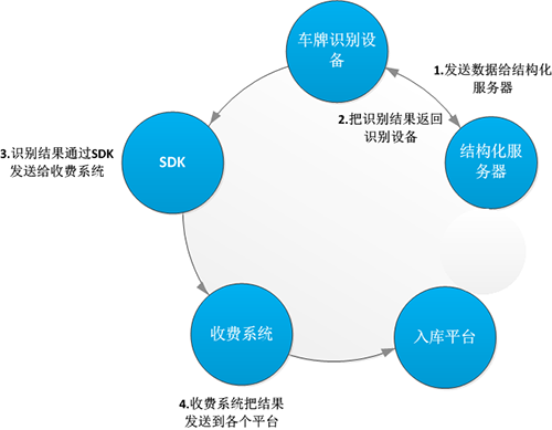車牌識(shí)別設(shè)備把采集的圖片和識(shí)別結(jié)果發(fā)送到結(jié)構(gòu)化服務(wù)器,結(jié)構(gòu)化服務(wù)器通過智能分析識(shí)別后把識(shí)別的結(jié)果返還給車牌識(shí)別設(shè)備,車牌識(shí)別設(shè)備通過SDK文件把識(shí)別結(jié)果發(fā)送到收費(fèi)系統(tǒng),收費(fèi)系統(tǒng)采用結(jié)果后再把數(shù)據(jù)發(fā)給入庫(kù)平臺(tái)。