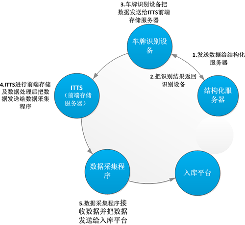 前端車牌識(shí)別設(shè)備發(fā)送數(shù)據(jù)給結(jié)構(gòu)化服務(wù)器,把識(shí)別結(jié)果返回識(shí)別設(shè)備,車牌識(shí)別設(shè)備把數(shù)據(jù)發(fā)送給ITTS(前端存儲(chǔ)服務(wù)器),ITTS(前端存儲(chǔ)服務(wù)器)進(jìn)行前端存儲(chǔ)及數(shù)據(jù)處理后把數(shù)據(jù)發(fā)送給數(shù)據(jù)采集程序,數(shù)據(jù)采集程序接收數(shù)據(jù)并把數(shù)據(jù)發(fā)送給入庫(kù)平臺(tái)。